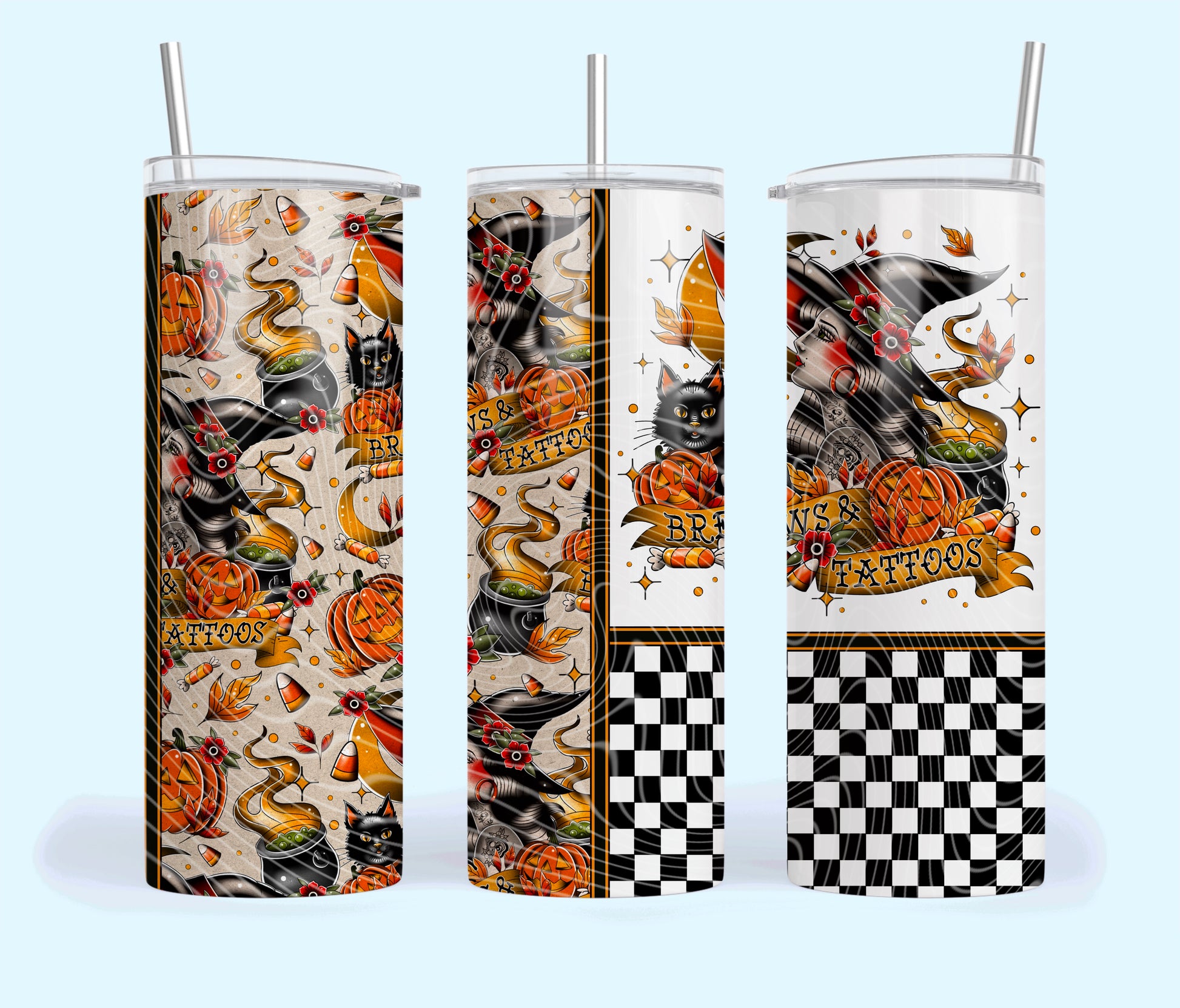 BREWS & TATTOOS WITCH Skinny Tumbler Design Png,BREWS & TATTOOS WITCH Clipart, BREWS & TATTOOS WITCH Clipart, Clipart for DTF or Shirt Printing, PNG Only!