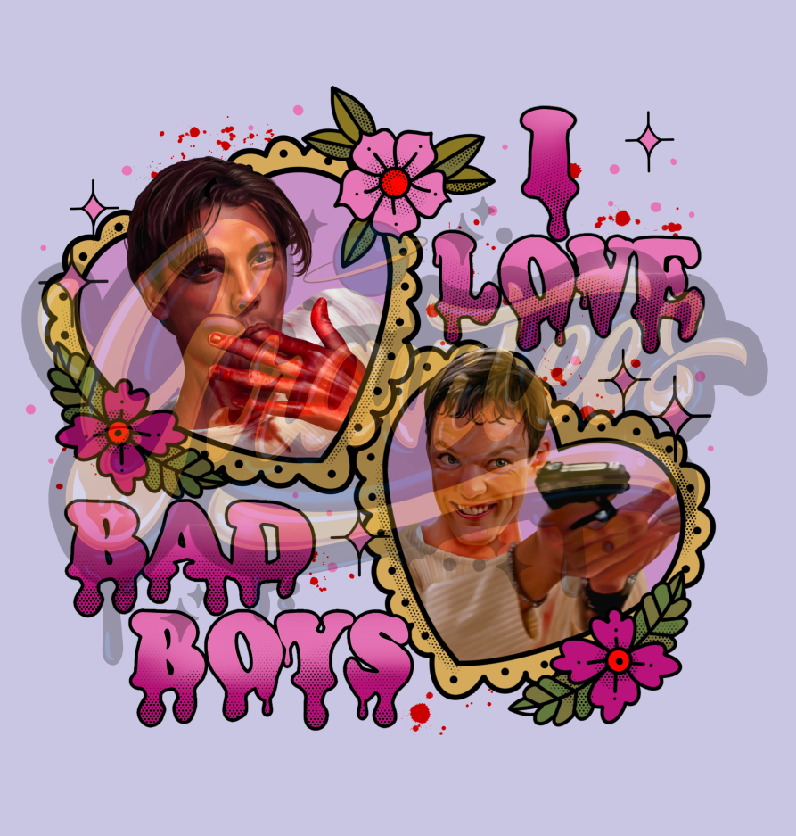 I Love Bad Boys Clipart design for DTF, film transfer printing. Distressed texture added - Great print for DIY shirt making.