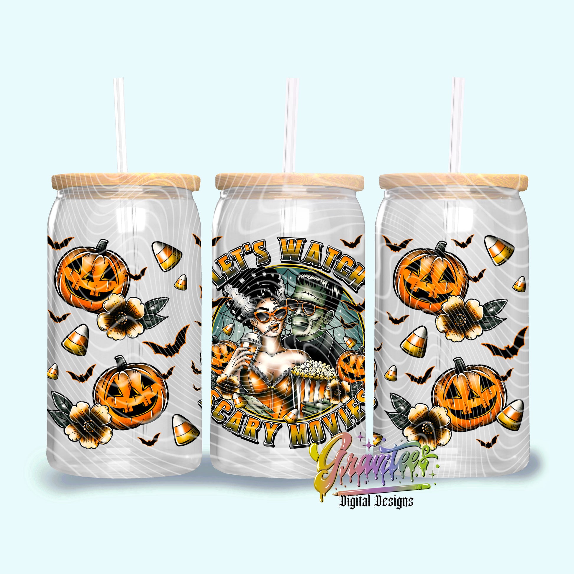 Let’s Watch Scary Movies 16oz Tumbler Template Design PNG, Fall Design for UVDTF or Sublimation Printing PNG Only!