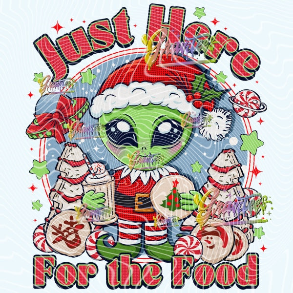 Just Here For The Food Alien Christmas Design for DTF or Sublimation Shirt Printing, PNG Only